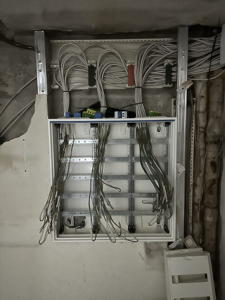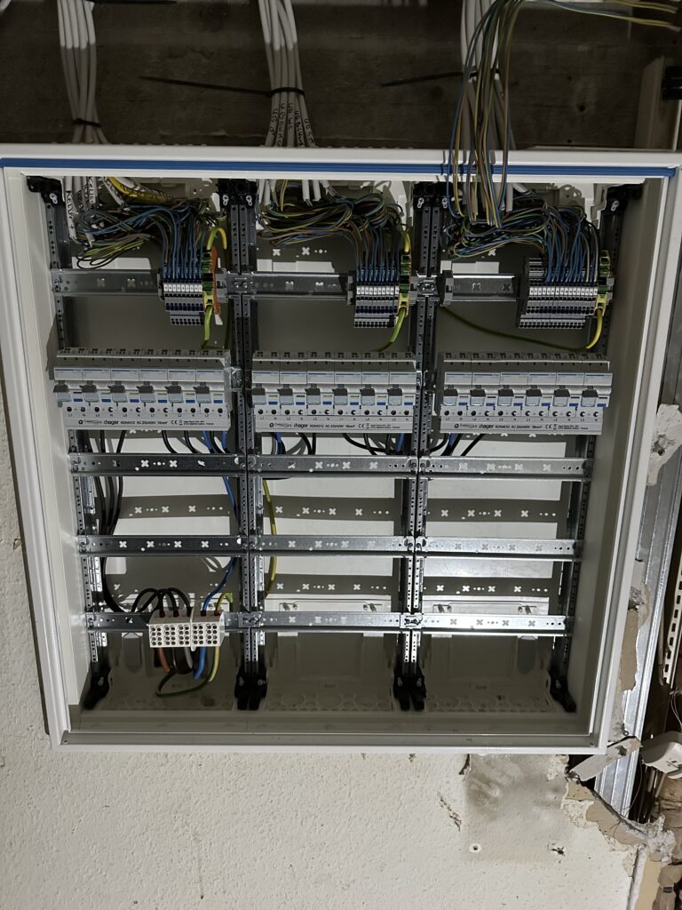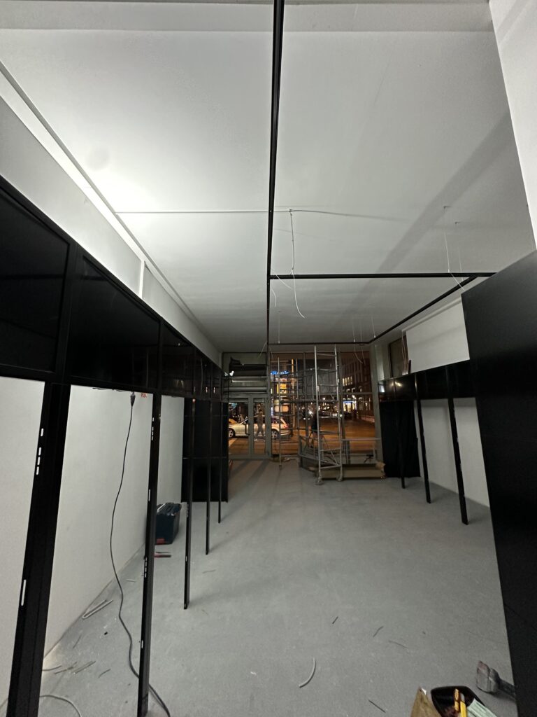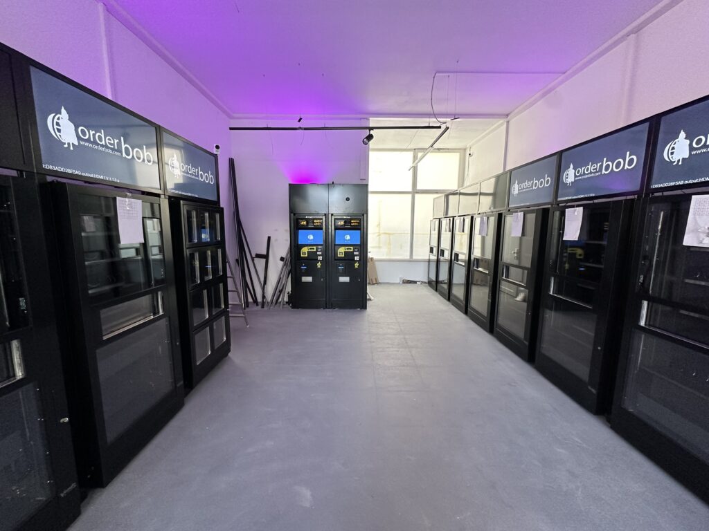 Im Rahmen der Arbeiten wurden neue Trennwände eingebaut, um die Fläche sinnvoll zu strukturieren und Bereiche für Verkaufsautomaten, Technik und Lager zu schaffen. Parallel dazu erfolgte eine vollständige Anpassung der Elektroinstallation. Neue Stromleitungen, zusätzliche Anschlüsse sowie eine moderne Beleuchtung wurden installiert, damit die Automaten sicher betrieben und optimal präsentiert werden können.